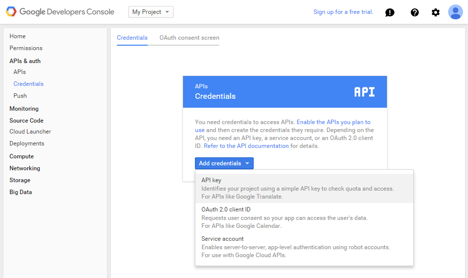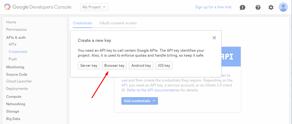 On the Google Developers Console site, click on the Create project button, set any name for it and wait until it's created.