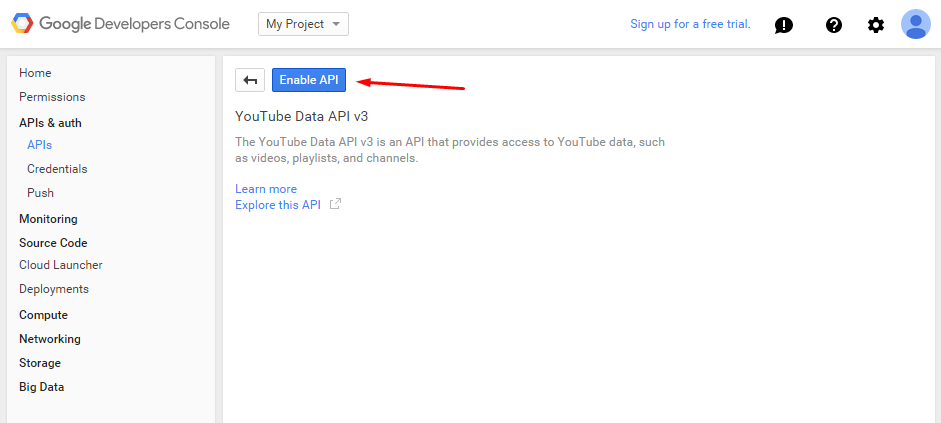 First we need to enable the YouTube Data API so go to APIs & auth > APIs, click on the YouTube Data API and on the Enable API button.
